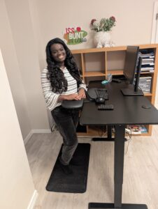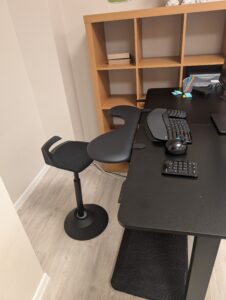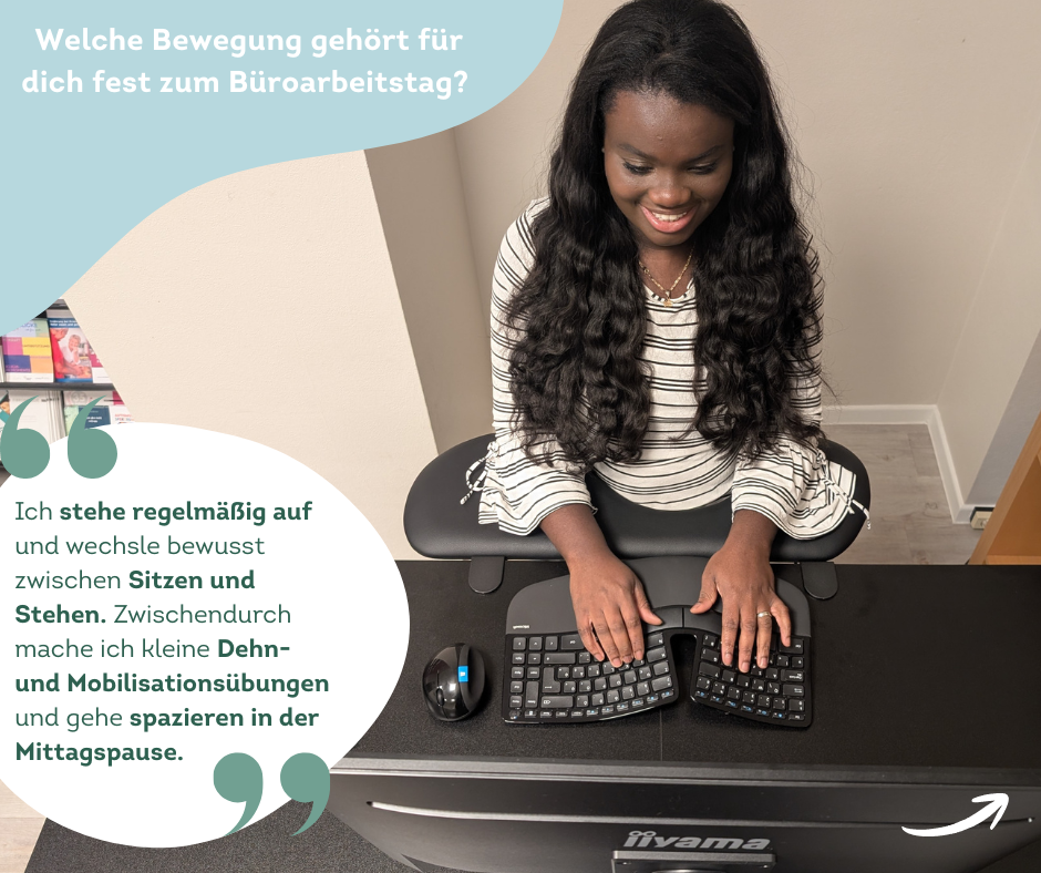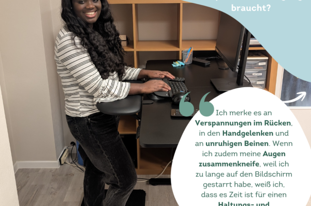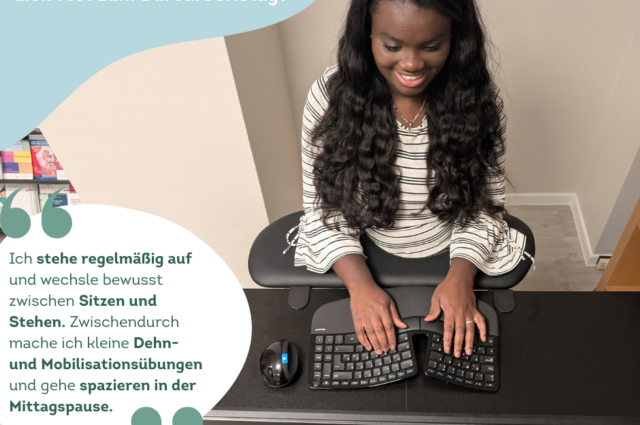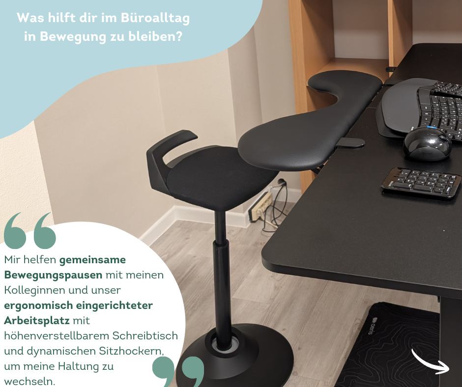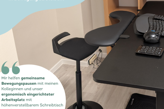 Mir helfen kleine gemeinsame Bewegungspausen mit meinen Kolleginnen sowie ein ergonomisch eingerichteter Arbeitsplatz mit höhenverstellbarem Schreibtisch und dynamischen Sitzhockern, um meine Haltung regelmäßig zu wechseln